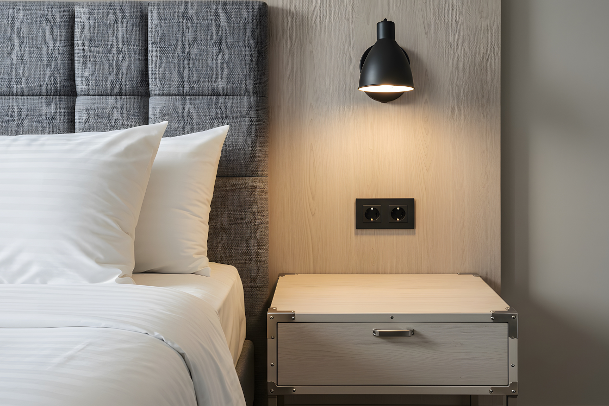 W sypialni praktycznym rozwiązaniem są kinkiety montowane nad stolikami nocnymi. Zastępują tradycyjne lampki stołowe, oszczędzając miejsce i zapewniając wygodne, kierunkowe światło do czytania.