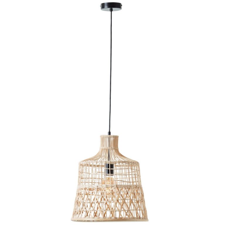 Jak dokładnie prezentuje się ten model? Budowa wiszącej lampy Newbury to połączenie ozdobnego designu i użyteczności. Oferowany model składa się z podsufitki w okrągłym kształcie, przewodu zasilającego, oprawki na jedno źródło światła oraz klosza o średnicy 36,5 cm. Najbardziej widowiskowy jest ostatni element pojedynczej lampy wiszącej Newbury. Klosz wykonany został z bambusowa i ma ażurową strukturę, przypominającą pleciony kosz. Bambusowa lampa wisząca Newbury prezentuje się niezwykle ozdobnie zarówno w ciągu dnia, jak i po zapaleniu, ponieważ dzięki światłu tworzy na ścianach dekoracyjne refleksy.