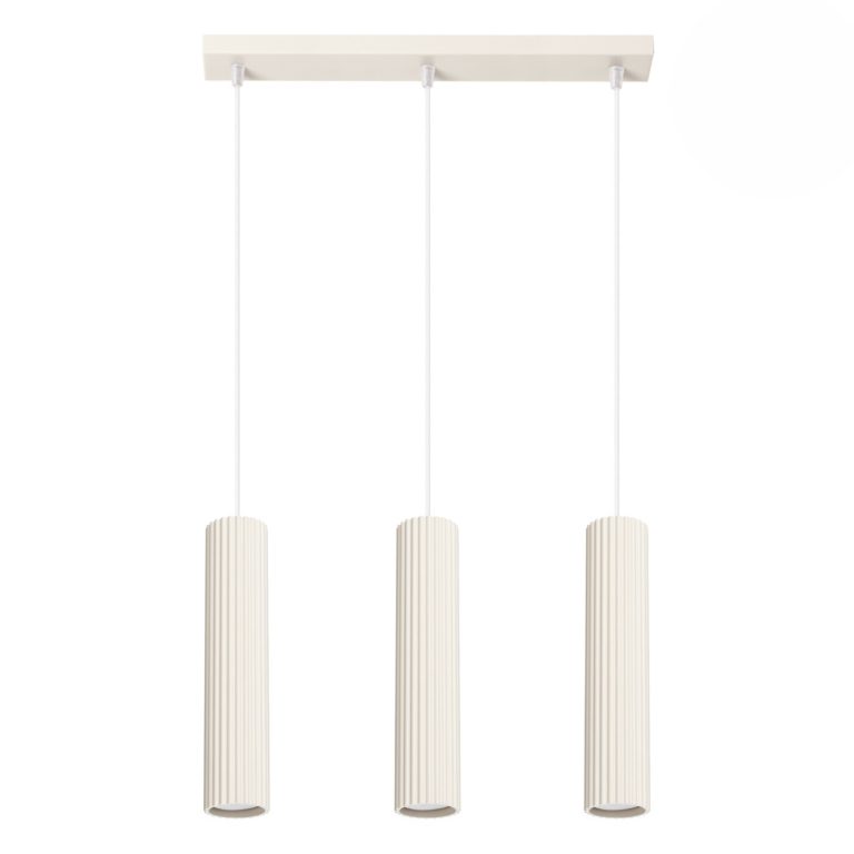 Beżowa lampa wisząca Dolkar 3 na listwie wyposażona jest w trzy klosze w kształcie tuby, które emitują skupione światło, jednocześnie wnosząc do wnętrza przyjemną atmosferę. Każdy z kloszy zawieszony jest na regulowanych kablach, co pozwala na dopasowanie wysokości oferowanej lampy potrójnej do indywidualnych potrzeb i charakteru pomieszczenia.
