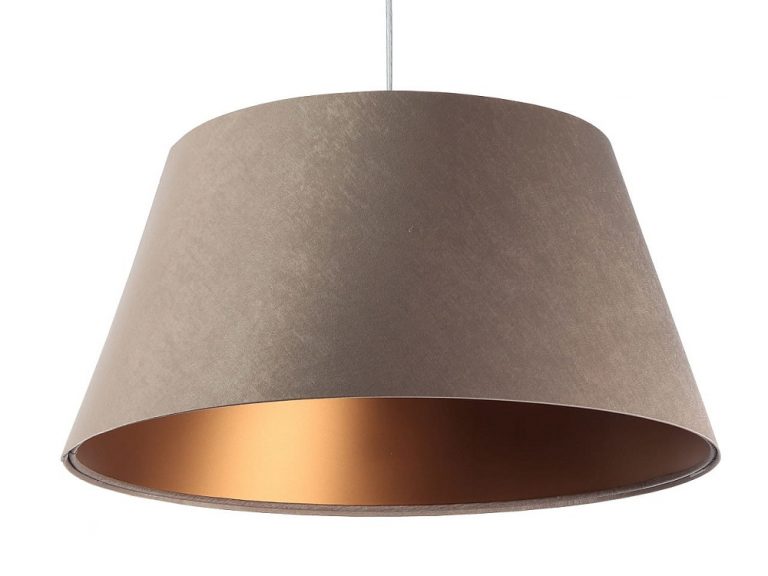 Podstawowe źródło światła w pomieszczeniach to oczywiście lampy sufitowe. Tworzą konkretny nastrój rozświetlając wnętrza, ale pełnią też funkcję ozdobną jako element wystroju wnętrz. Lampa wisząca z abażurem Nella to propozycja na z pozoru proste, ale jednak nieco nietuzinkowe oświetlenie sufitowe. Wszystko dzięki połączeniu klasycznego kształtu stożkowego abażuru w kolorze beżu z nutką szarości oraz miedzianego wnętrza. Wierzch abażuru pokryty jest stylową satyną, która z natury jest lekko błyszcząca i bardzo efektowna, ale to właśnie pięknie odbijający światło środek przyciąga spojrzenia. Takie zestawienie sprawia, że lampa sufitowa Nella to niesztampowy i odrobinę ekskluzywny element wyposażenia wnętrz.