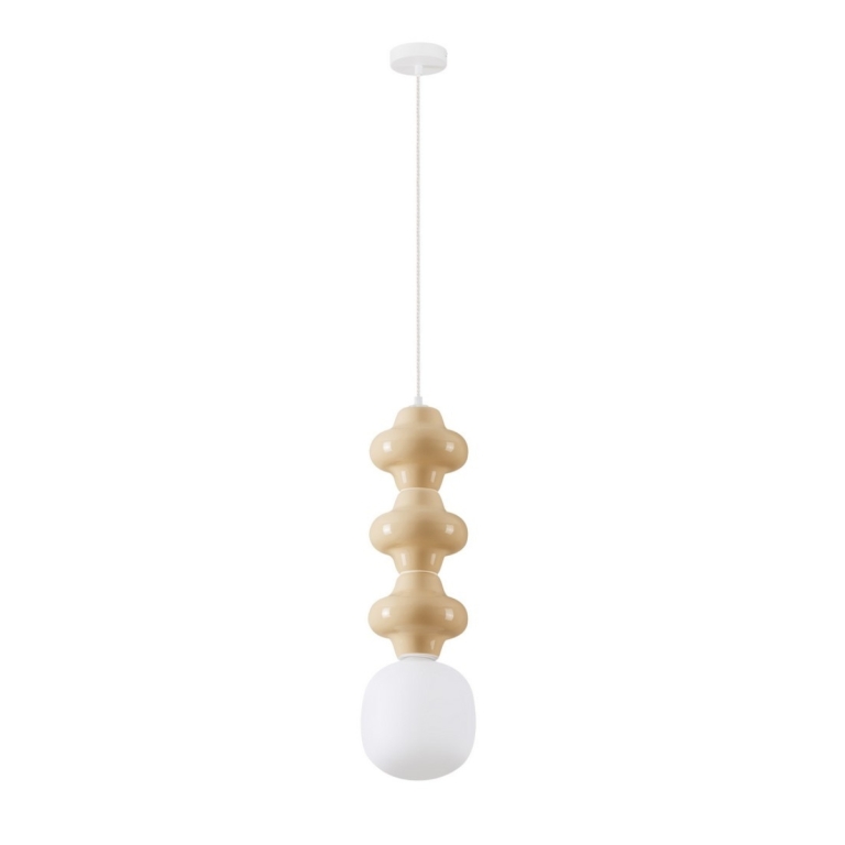 Beżowa lampa wisząca Vilrosa C z unikatowym kloszem wykonanym z ceramiki i szkła emanuje ciepłem i delikatnością, a jednocześnie wyróżnia się ponadczasową elegancją. Połączenie beżu z bielą nadaje lampie lekkości i sprawia, że jest to idealnie oświetlenie do nowoczesnych wnętrz, także inspirowanych stylem skandynawskim, a nawet boho.