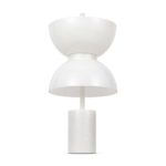Biała lampa stołowa Kyoto z nietypowym kloszem posiada marmurową podstawę oraz metalowy klosz. Całość ma 46 cm wysokości oraz szerokość 22 cm. Oferowana lampka nocna wyposażona jest w oświetlenie LED o optymalnej ciepłej barwie.