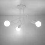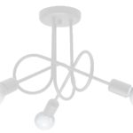 Lampa do salonu Crazy 3 wykonana jest z metalu i składa się z okrągłej podsufitki, designerskich splecionych ramion oraz oprawek na żarówki E27. Model całkowicie pozbawiony jest tradycyjnych kloszy, co nadaje mu minimalistycznego wyglądu. Biała lampa sufitowa Crazy 3 do salonu doskonale komponuje się przez to z aranżacjami nowoczesnymi i loftowymi.