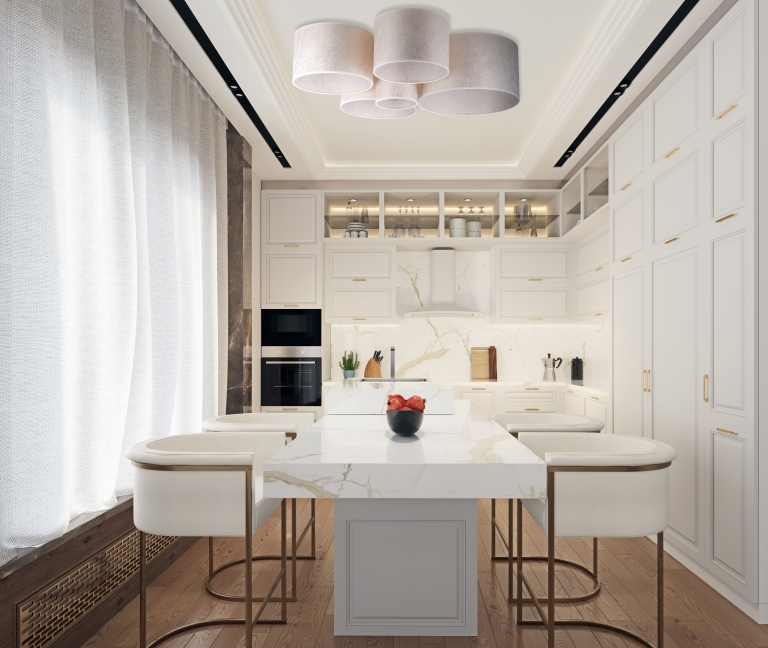 Biała lampa wisząca na listwie Enkel 3 L nad wyspę kuchenną
