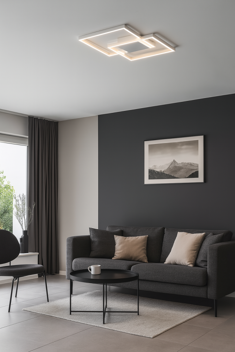 Biała lampa sufitowa Mata C LED stworzona została w duchu minimalizmu, dlatego idealnie pasuje do nowoczesnych, stonowanych aranżacji. Podwójny, geometryczny klosz o wysokości zaledwie 6 cm sprawia, że lampa doskonale odnajdzie się zarówno w standardowych, jak i w niższych pomieszczeniach, a także na podwieszanych sufitach.