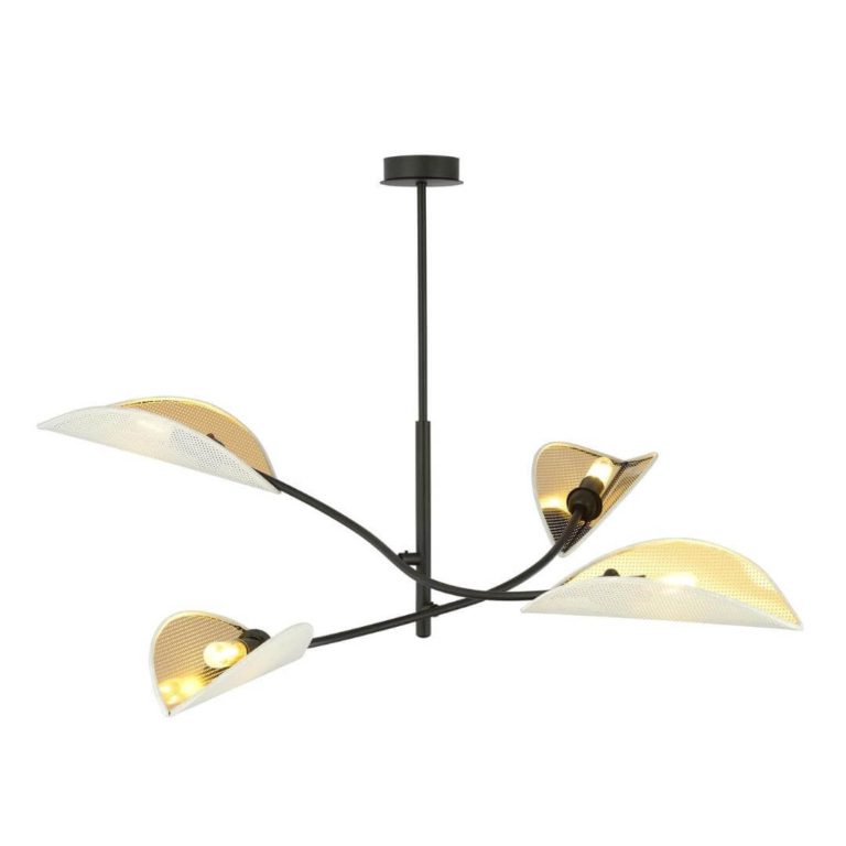 Biała lampa sufitowa na czarnym stelażu Erin 4 wyposażona jest w cztery klosze, których wewnętrzna część przepięknie mieni się na złoto. Wszystkie trzy kolory użyte w proponowanym oświetleniu idealnie się ze sobą komponują. To wyjątkowo klasyczne barwy, dzięki którym każda stworzona przez Ciebie aranżacja emanować będzie elegancją.