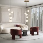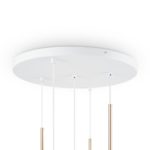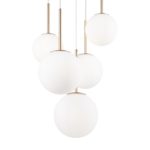 Poza podsufitką, lampa biała Basic form 5 wyposażona jest w wyjątkowo modne obecnie klosze w kształcie idealnych kul. Klosze wykonane są z mlecznego szkła i mają trzy różne średnice (15, 18 i 20 cm). Biała lampa wisząca Basic form 5 na okrągłej podsufitce urzeka elegancją, której dodają jej także złote detale z metalu.