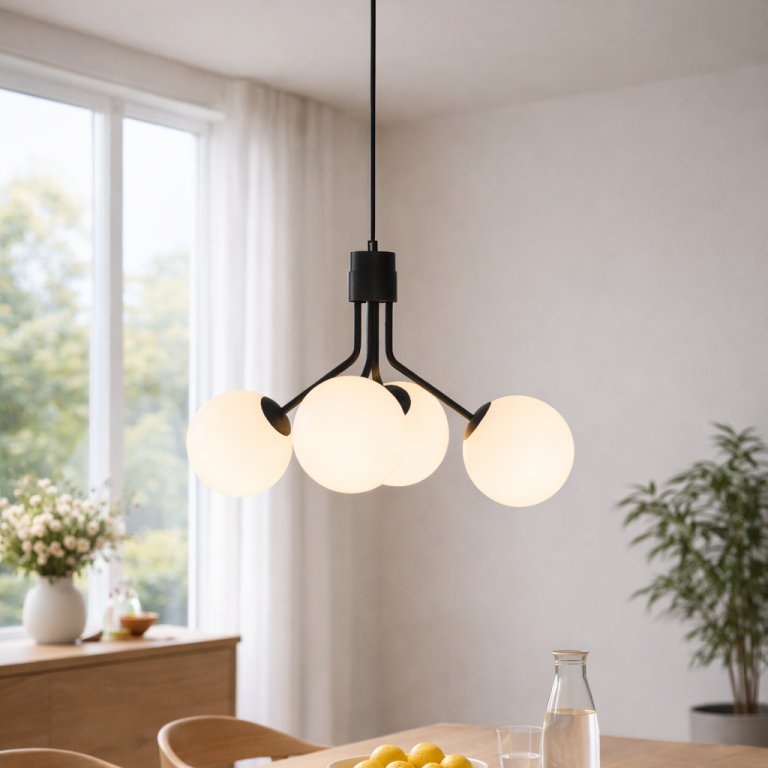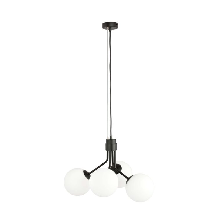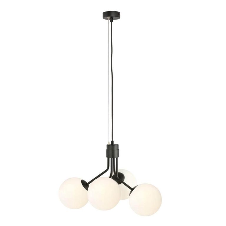 Polecana przez nasz sklep lampa wisząca do salonu i sypialni Bond 4 przyciąga do siebie uwagę metalowym designerskim stelażem z wygiętymi ramionami oraz czterema kloszami. Każdy z nich ma kształt idealnej kuli i wykonany został z białego szkła. Jego zaletą jest doskonałe rozpraszanie światła oraz bardzo elegancki i nowoczesny wygląd, który będzie prawdziwą ozdobą Twojego domu. Biała lampa wisząca na czarnym stelażu Bond 4 idealnie komponuje się z minimalistycznymi aranżacjami, które głównie skupiają się na funkcjonalności. Nie znaczy to, że omawiana oprawa pozbawiona jest dekoracyjności – wręcz przeciwnie – to oświetlenie w nowoczesnym stylu o wysokich walorach estetycznych.