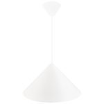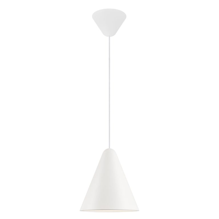 Metalowa biała lampa wisząca Nono to pojedynczy zwis wyposażony w stożkowy klosz. Oprawa oświetla wnętrze od góry, dlatego znakomicie sprawdza się jako lampa nad stół, wyspę kuchenną, czy inny blat w kuchni i jadalni. Biała lampa wisząca Nono z metalowym kloszem to jednak również model, który możesz wykorzystać do rozjaśnienia całego pomieszczenia. Tym bardziej, że oferowana oprawa oświetleniowa dostępna jest w dwóch wariantach, które różnią się od siebie średnicą klosza.