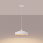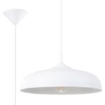 Polecana lampa w białym kolorze składa się z trzech głównych elementów: podsufitki, zawieszenia oraz klosza. Model wyróżnia się prostą formą, a cała oprawa świetlna wykonana jest z metalu. Biała lampa wisząca Vargas ma wysokość 74 cm – przewód zasilający możesz jednak skrócić, aby idealnie dopasować lampę do wnętrza.