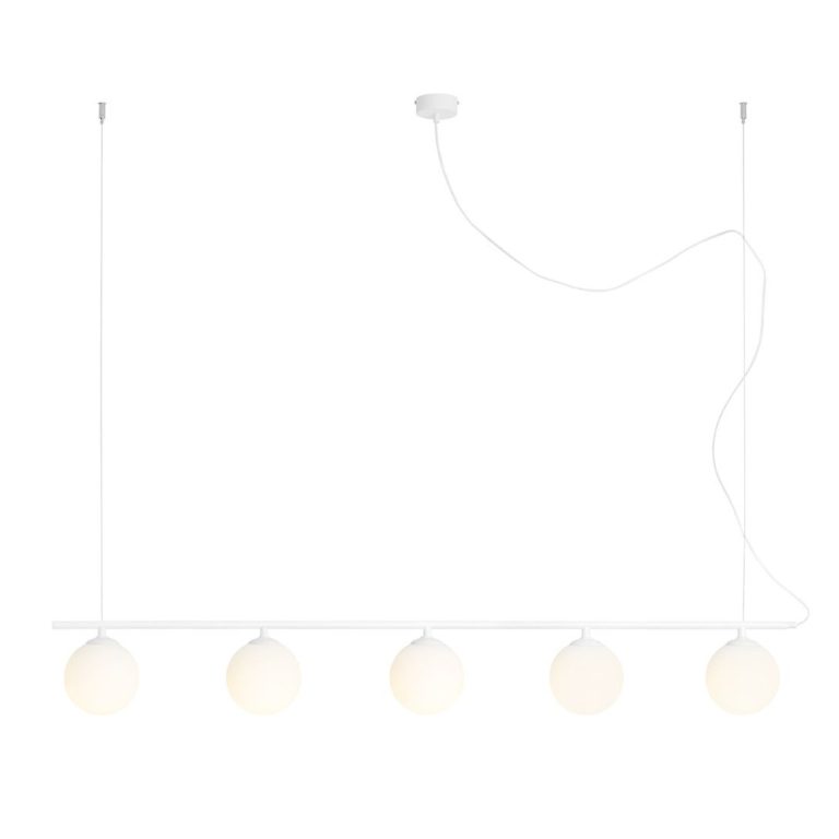 Dzięki uniwersalnej białej kolorystyce lampa wisząca-listwa Bari 5 współgra praktycznie z każdą aranżacją. Szczególnie dobrze prezentuje się we wnętrzach urządzonych w stylu nowoczesnym oraz minimalistycznym. Biała lampa wisząca z kulistymi kloszami Bari 5 sprawdzi się jednak również w wystroju skandynawskim, czy eklektycznym, jako designerskie dodatek, a jednocześnie doskonałe źródło światła. Oferowany model możesz wykorzystać w roli lampy wiszącej nad wyspę kuchenną, czy też alternatywy dla żyrandola w salonie.
