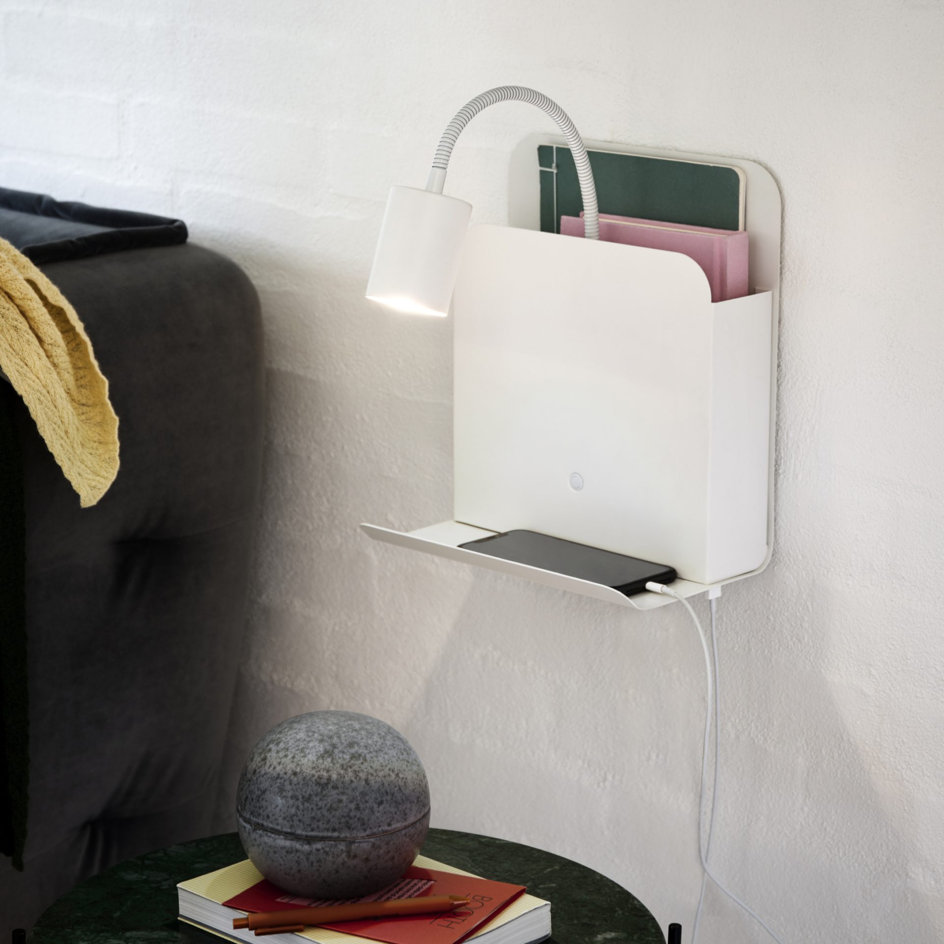 Biała lampka ścienna Roomi z regulowanym ramieniem składa się z punktowego źródła światła, które możesz skierować w dowolną stronę, zapewniając sobie całkowity komfort podczas czytania lub pracy. Kinkiet punktowy Roomi wyposażony został także w miejsce na książkę, zeszyty, czy czasopisma, a także w małą półeczkę i stację ładującą USB. Cała lampa do sypialni Roomi ma wysokość 28,2 cm, szerokość 24,8 cm oraz głębokość 16,5 cm. Klosz przystosowany jest do różnych źródeł światła (w tym do żarówek LED).
