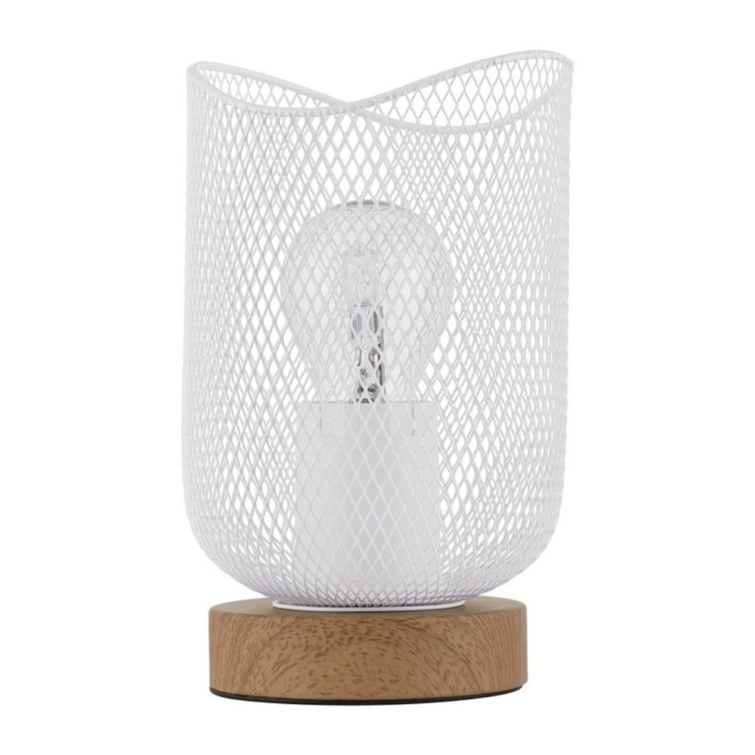 Biała lampka stołowa Baque na podstawie imitującej drewno