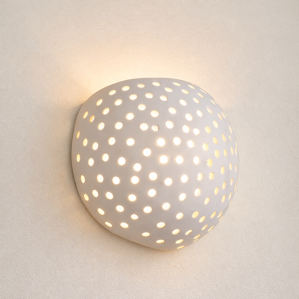 Oferowana przez nasz sklep lampa ścienna do sypialni Gipsy Perforated składa się z efektownego klosza o zaokrąglonym kształcie, wykonanego z gipsu w białym kolorze. Oprawa ta zawdzięcza swój unikatowy i efektowny wygląd licznym otworkom, przez które swobodnie przechodzi światło. Ten nietuzinkowy, perforowany klosz sprawia, że tworzą się przepiękne, świetliste refleksy, wprowadzające do wnętrza wyjątkowo nastrojową i przyjemną atmosferę.