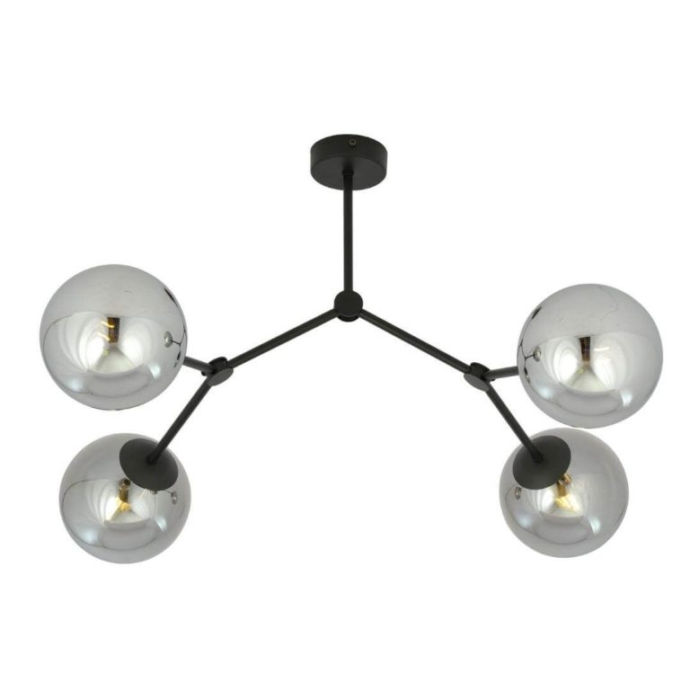 Omawiany tutaj model oświetlenia na sufit Helga 4 to nietypowa metalowa konstrukcja, na którą składają się: podsufitka oraz ramiona z przegubami. Uzupełniają ją cztery źródła światła w oprawie kloszy w kulistym kształcie, które wykonane zostały z popielatego szkła o przepięknym, połyskującym wykończeniu. Co do wymiarów: wysokość całej lampy sufitowej wynosi 56,5 cm, natomiast szerokość 80 cm. Każdy klosz ma średnicę 14 cm.