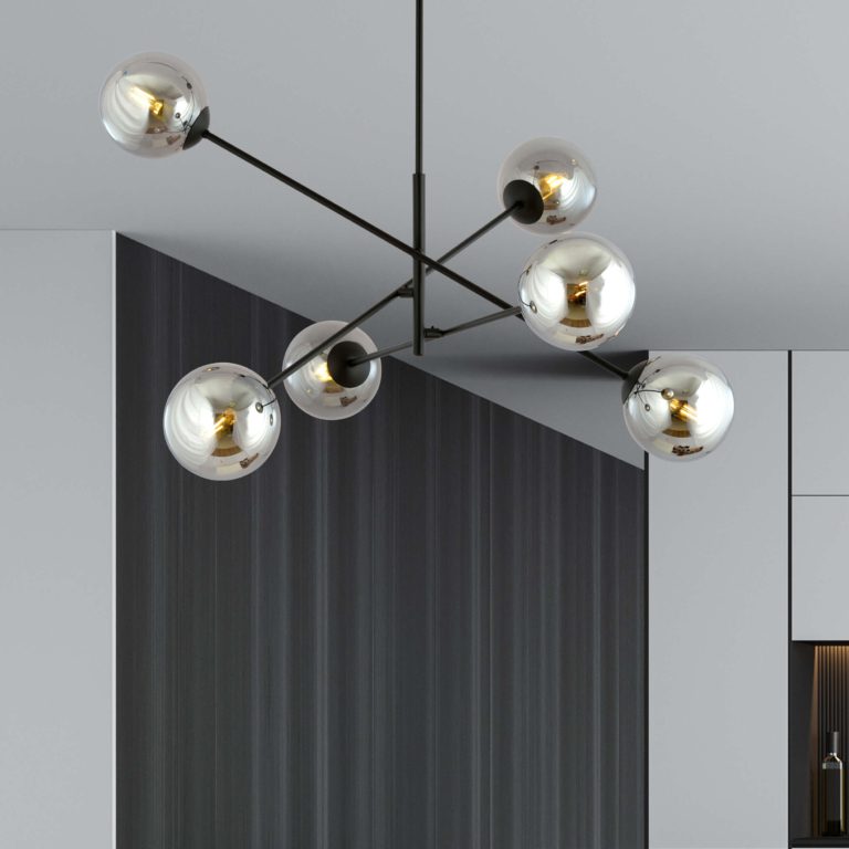 Najbardziej charakterystyczne dla oświetlenia na sufit Frix 6 są zdecydowanie wspomniane wyżej klosze. Każdy z nich ma identyczny kształt kuli oraz tę samą średnicę 14 cm. Wszystkie również wykonano z tego samego, niezwykle atrakcyjnego wizualnie szkła o popielatym kolorze i połyskującym wykończeniu. Oferowana lampa sufitowa doskonale wypełnia wnętrze światłem, ale również przepięknie odbija światło, właśnie dzięki zjawiskowym kloszom.