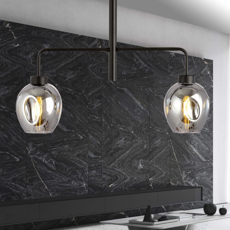 Polecana przez nasz sklep internetowy lampa Dan 2 to prosty stelaż z dwoma ramionami, na których znajdują się źródła światła w wyżej wspomnianych kloszach. Te naprawdę unikatowe oprawy dla żarówek wykonane zostały ze szkła o ponadczasowym uroku. Wyróżnia je niezwykły, popielaty odcień, który dodatkowo cudownie połyskuje, a tym samym odbija światło. Całe wnętrze wypełnia się blaskiem! Stelaż ze stali lakierowanej na czarno zapewnia stabilność całej konstrukcji oraz równoważy krzykliwość kloszy.
