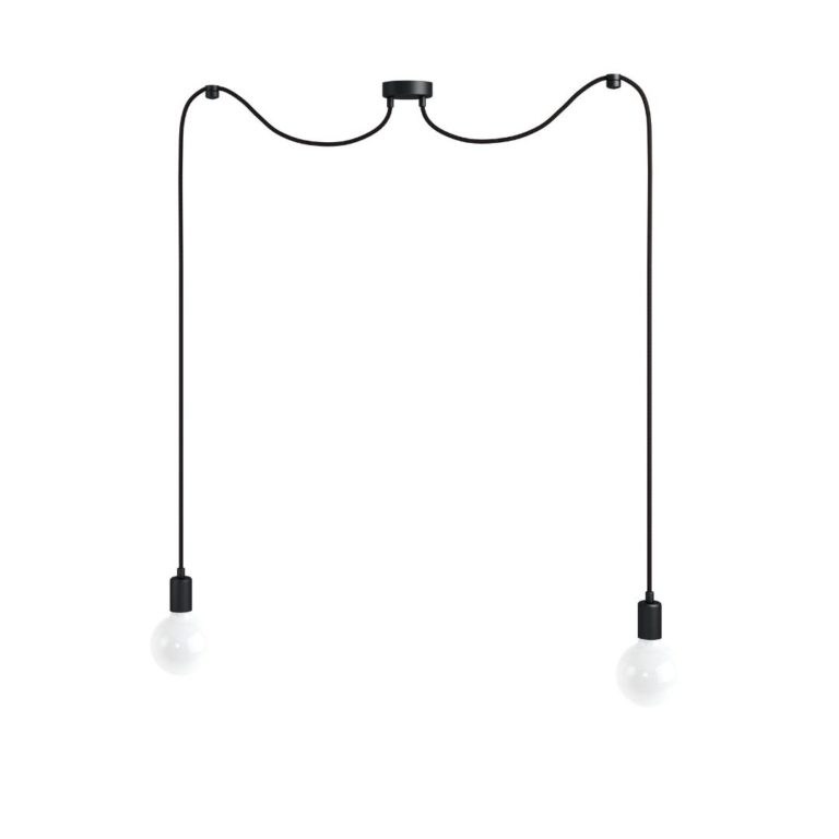 Kompozycja tej salonowej lampy jest bardzo prosta i klasyczna: dwa długie czarne kable w stylowym oplocie zakończone gwintami z metalową nakładką, czarna elegancka podsufitka oraz sufitowe uchwyty umożliwiające dowolne rozmieszczenie przewodów na górze. Plus Twoja wyobraźnia, która pozwoli zaaranżować ten industrialny żyrandol według własnego pomysłu pasującego do aranżacji. Każdy z kabli ma 2 metry długości, zatem masz duże pole do popisu! Ta czarna lampa do loftu może być minimalistycznie zawieszona tuż pod sufitem, jak również designersko zwisać prezentując czarne kable oraz ozdobne żarówki.