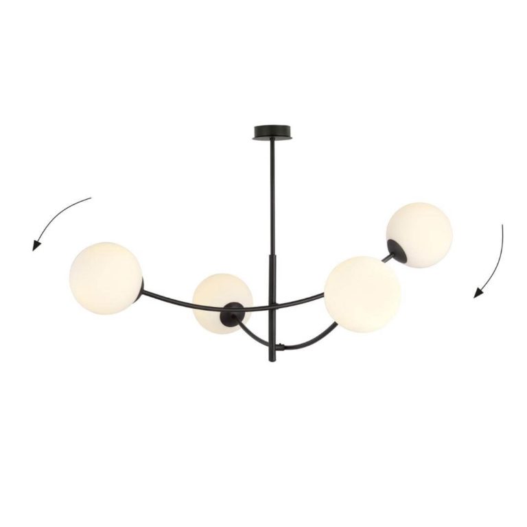 Stelaż wraz z wygiętymi łukowo ramionami, wykonany został z wytrzymałej stali, klosze natomiast ze szkła. Jeśli chodzi o wielkość, czarna lampa sufitowa do salonu Orbis 4 ma szerokość 89 cm oraz wysokość 63 cm – nadaje się więc do praktycznie każdego wnętrza. Każdy klosz ma kształt kuli o średnicy 15 cm. Dodatkowym atutem jest ruchomy stelaż, który pozwala jeszcze lepiej dopasować oświetlenie do konkretnego pomieszczenia i zapotrzebowania.