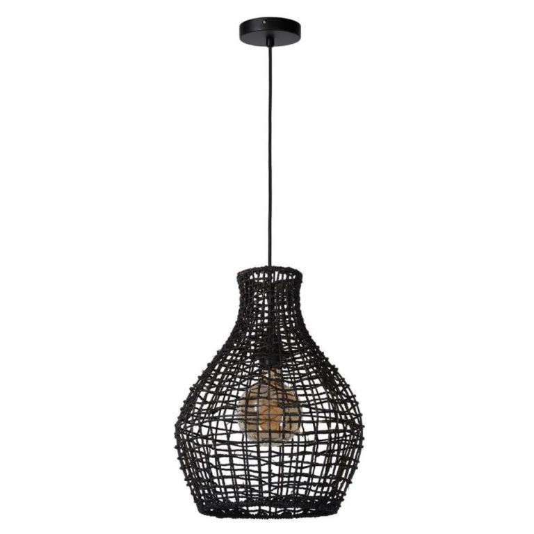 Oferowana lampa wisząca w stylu boho Alban ma postać pojedynczego zwisu, który składa się z okrągłej podsufitki, długiego przewodu oraz oryginalnego klosza. To właśnie ten ostatni element jest wyjątkowo atrakcyjny wizualne. Klosz wykonany jest z rattanowej plecionki, której ażurowa struktura tworzy przepiękną bryłę o zaokrąglonym kształcie. Co dość nietypowe dla rattanowej lampy – jej kolor jest czarny.