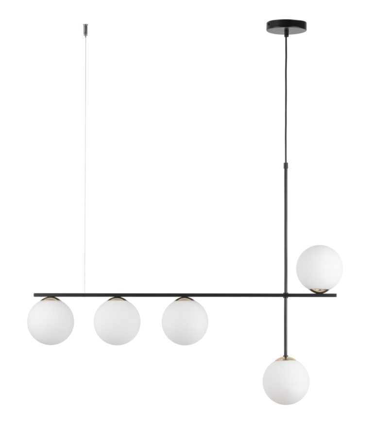 Lampa wisząca do kuchni i jadalni Bera 5 to nowoczesna forma oraz klasyczne zestawienie barw. Oferowane oświetlenie składa się z prostego stelaża z metalu w czarnym kolorze i pięciu białych kloszy ze szkła. Wszystkie klosze mają kształt kuli o średnicy 14 cm. Czarna lampa wisząca Bera 5 nad stół ma całkowitą szerokość 94 cm oraz wysokość, którą można regulować (max. 110 cm). Z kwestii technicznych warto także wspomnieć o możliwość doboru nie tylko standardowej, ale i ściemnialnej żarówki.
