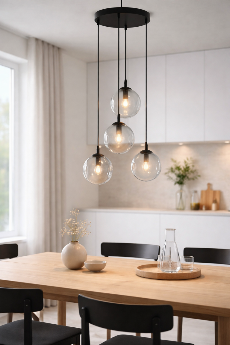 Oprawa oferowane modelu utrzymana jest w klasycznej, czarnej kolorystyce, która jeszcze bardziej podkreśla oryginalny charakter transparentnych kloszy. Lampa wisząca z kulistymi kloszami Blair 4 Ring świetnie pasować będzie do wszystkich nowoczesnych aranżacji. Oświetlenie to doskonale zestawia się również ze stylem industrialnym oraz loftowym. Uniwersalności dodaje także regulowane zawieszenie, które sprawia, że możesz dopasować długość lampy do wysokości wybranego pomieszczenia.
