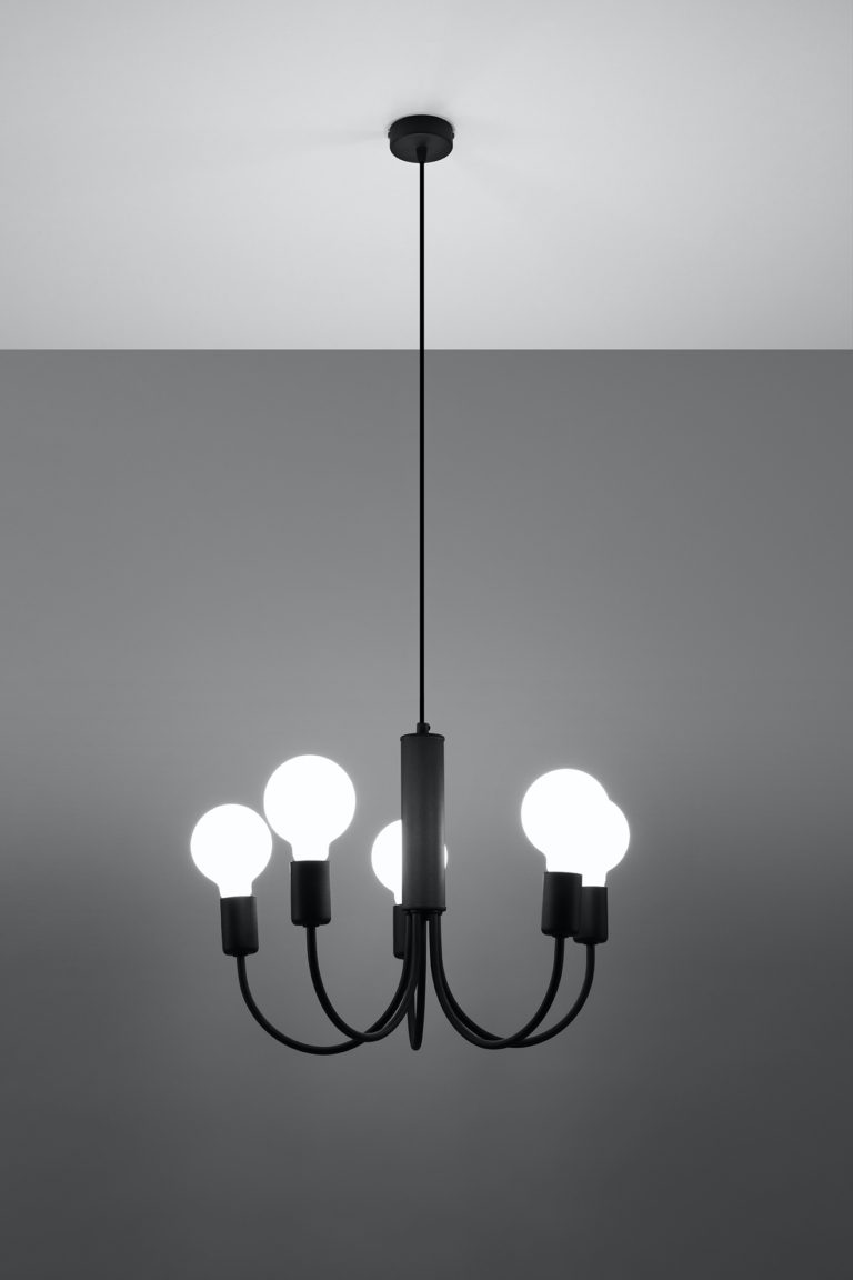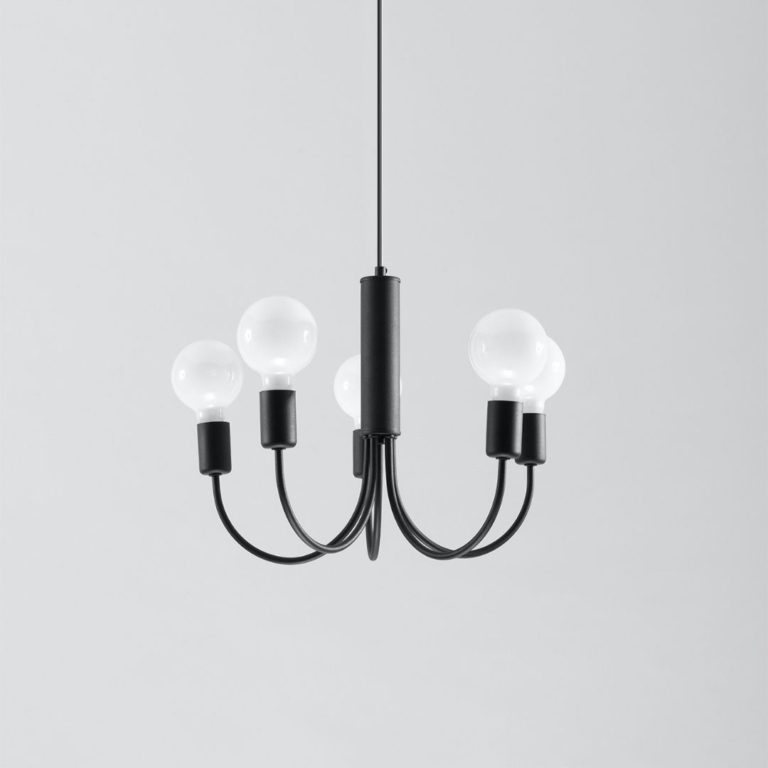 Lampa wisząca w czarnym kolorze Hook 5 inspirowana jest wyglądem klasycznych żyrandoli świecznikowych. Składa się z podsufitki, przewodu oraz stelaża z pięcioma wygiętymi stylowo ramionami, które wyposażone w oprawki na źródła światła. Oświetlenie to emanuje wytwornością, ale wciąż pozostaje nowoczesne i funkcjonalne. Jest również wyjątkowo solidne, ponieważ wykonane jest z odpornej na uszkodzenia i otarcia stali.