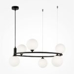Czarna lampa wisząca Ring 6 w nowoczesnym designie wyposażona jest w metalowy stelaż w kształcie pierścienia oraz w sześć kloszy wykonanych ze szkła. Czarny stelaż zestawiony został z bielą kloszy – kolorystyka wiszącej lampy Ring 6 idealnie pasuje do współczesnych aranżacji.