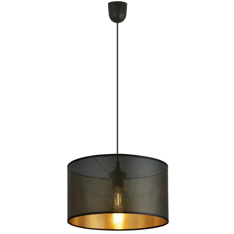 Lampa wisząca w klasycznym stylu Sofia przykuwa uwagę zjawiskowym abażurem o kształcie cylindra i wykonanym z siateczki. Wewnętrzna strona klosza ma złoty kolor i pięknie połyskuje, szczególnie w świetle, zewnętrzna zaś jest czarna – podobnie jak pozostała część całej oprawy. Ten polecany przez nas model oświetlenia do wnętrz emanuje niezwykłą dekoracyjność, a jednocześnie, dzięki prostej formie, nie jest przesadnie strojny, a wręcz przeciwnie – wyjątkowo elegancki i stylowy.