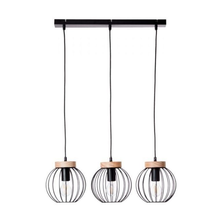 Oferowany model to wysokiej jakości lampa na listwie, którą montuje się bezpośrednio do sufitu. Z podłużnego stelaża o szerokości 65,5 cm wychodzą trzy pojedyncze zwisy, które z kolei wyposażone są w wyjątkowo designerskie abażury o dekoracyjnym potencjalne. Każdy z nich ma kulistą formę, która wykonana jest z drucianych elementów, tworzących ażurową bryłę. W jej wnętrzu kryje się oprawka na źródło światła. Dodatkowo każdy abażur ozdobiony jest drewnianym detalem, który świetnie współgra z pozostałą część wiszącej lampy Sorana 3.