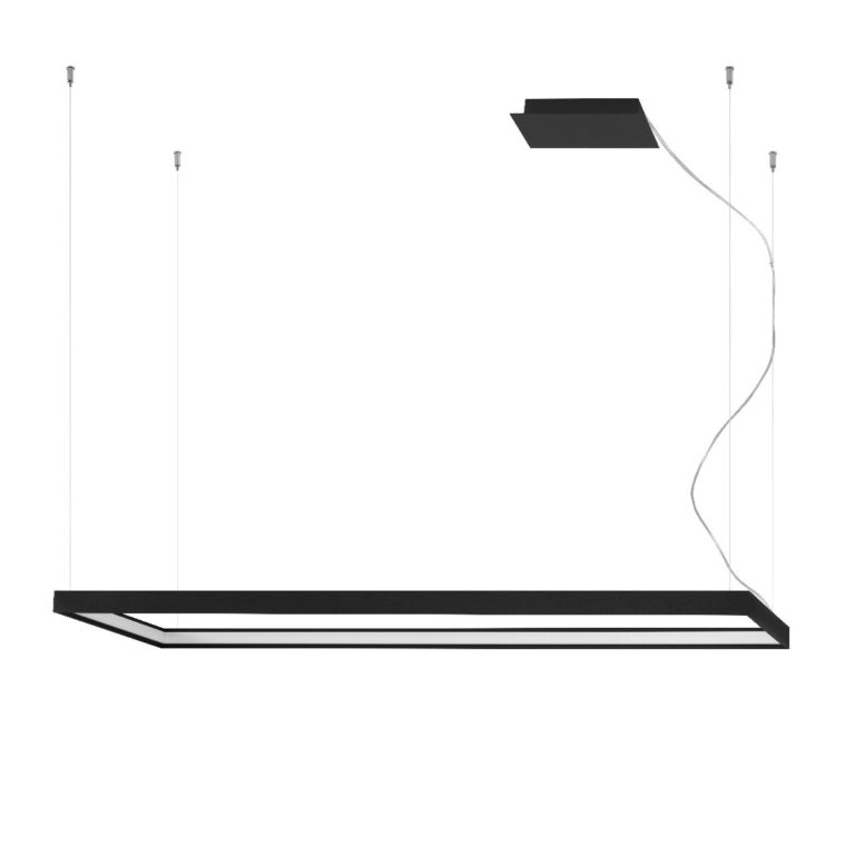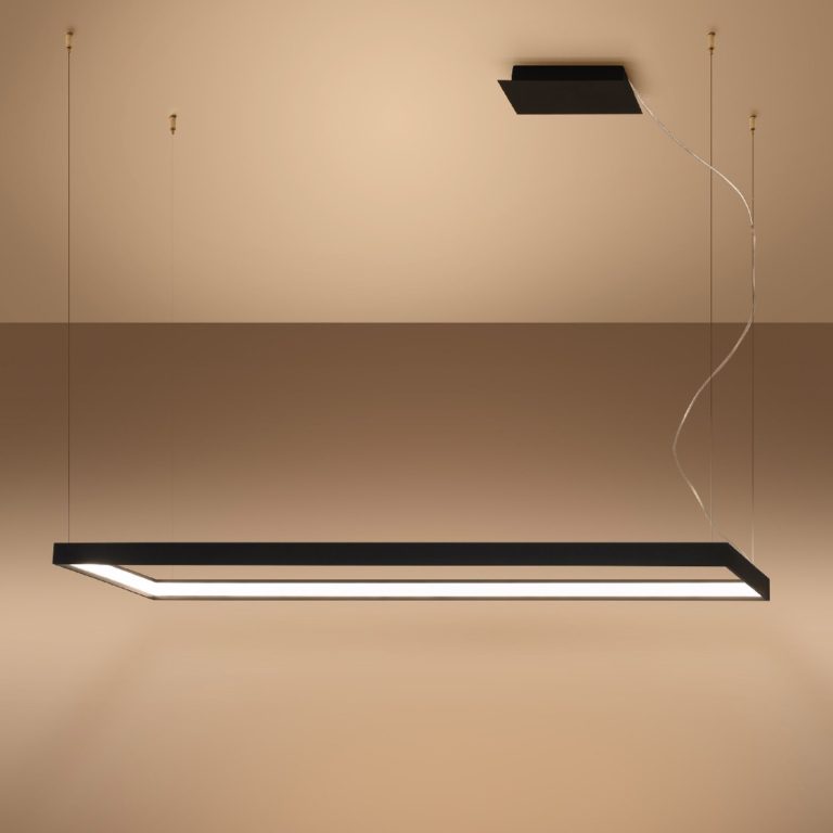 Model wyróżnia się charakterystycznym prostokątnym kształtem klosza, który zawiesza się na niemal niewidocznych linkach, tworzących wrażenie lampy unoszącej się w powietrzu. Prosta geometryczne linie zestawione zostały z klasyczną czarną kolorystyką, która podkreśla charakter wnętrza i doskonale komponuje się z innymi kolorami. Całość doskonale ze sobą harmonizuje i idealnie odnajduje się w aranżacjach inspirowanych minimalizmem, w których znajdą się na przykład betonowe, szklane lub drewniane powierzchnie.