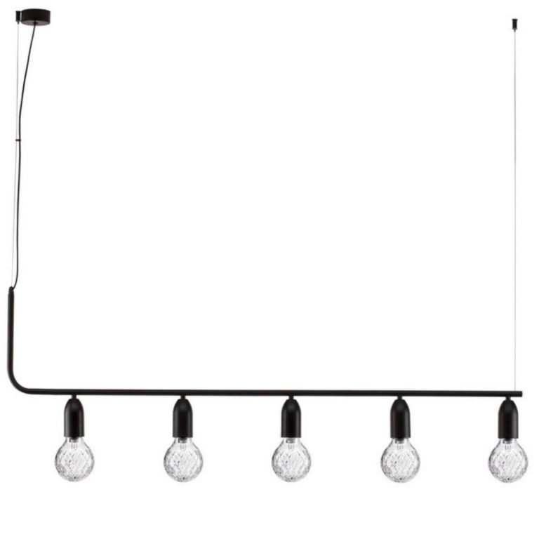 Designerska lampa sufitowa Bani składa się z podłużnego, wygiętego ramienia, na którym umieszczono pięć punktów świetlnych. Lampa przymocowana jest do sufitu za pomocą podsufitki oraz czarnego kabla z jednej strony i transparentnego uchwytu z drugiej strony ramienia. Zwróć uwagę na prostą kompozycję lampy, cylindryczną obudowę gwintów oraz przepiękne ozdobne szklane klosze w kształcie dużej żarówki. Fantastyczny jest pomysł na to podłużne oświetlenie sufitowe, prawda?