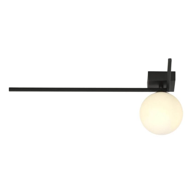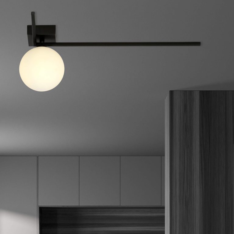 Oferowany model składa się z trzech elementów: podsufitki, półramy oraz kulistego klosza. Dwie pierwsze części wykonane zostały ze stali lakierowanej na czarno, natomiast oprawa dla żarówki z białego szkła. Tak prezentująca się lampa sufitowa do salonu Sole M nawiązuje do mody na geometryczne formy. Wprowadzają one do wnętrza energię i dynamizm i świetnie komponują się ze stylistyką nowoczesną. Proste kształty sufitowego oświetlenia Sole M dodatkowo podkreślone zostały kontrastowymi kolorami.