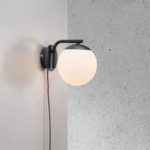 Ścienny kinkiet Grant to dwa główne elementy: szklany kulisty klosz w mlecznobiałym kolorze oraz metalowy czarny stelaż, na który składa się przyściennik i wygięte ramię. Oferowana lampa-kula wyjątkowo dobrze rozprasza światło, dlatego nadaje się zarówno do czytania i pracy, jak i po prostu do doświetlenia wybranej przestrzeni. Czarny kinkiet ścienny Grant z kloszem w kształcie kuli charakteryzuje się również niewielkim rozmiarem, dlatego pasuje do mniejszych i większych wnętrz.