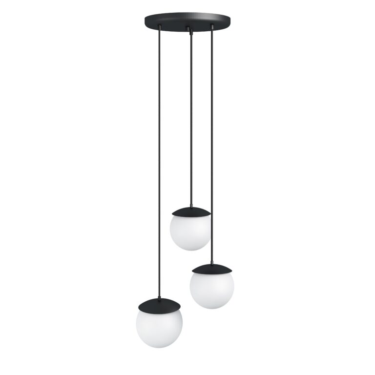 Urządzasz w swoim domu minimalistyczne wnętrze? Czarny żyrandol kaskadowy KUUL F 3 właśnie w takich prezentuje się najokazalej. Solidna podsufitka o średnicy trzydziestu centymetrów ma za zadanie podtrzymać trzy okrągłe szklane klosze zawieszone na czarnych przewodach, których długość możesz regulować w zależności od potrzeby chwili – to duża zaleta tej pięknej lampy. Białe kule wiszące tuż nad stołem sprawdzą się bowiem na przykład podczas pracy, a podciągnięte nieco wyżej równomiernie oświetlą całe pomieszczenie.