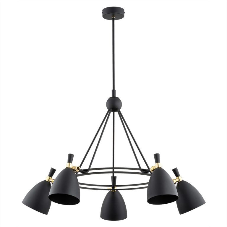 Loftowy żyrandol z metalu Charlotte 5 ma wysokość 92 cm oraz szerokość 75 cm. Każdy klosz ma stożkowy kształt i średnicę 13 cm. Wśród największych zalet sufitowej lampy Charlotte 5 wyróżnić warto również jej funkcjonalność – model umożliwia modyfikację emisji światła z wszystkich włączonych żarówek na system 2+3. Ponadto czarny żyrandol w stylu loftowym Charlotte 5 przystosowany jest do różnych źródeł światła, także do energooszczędnych ledów.