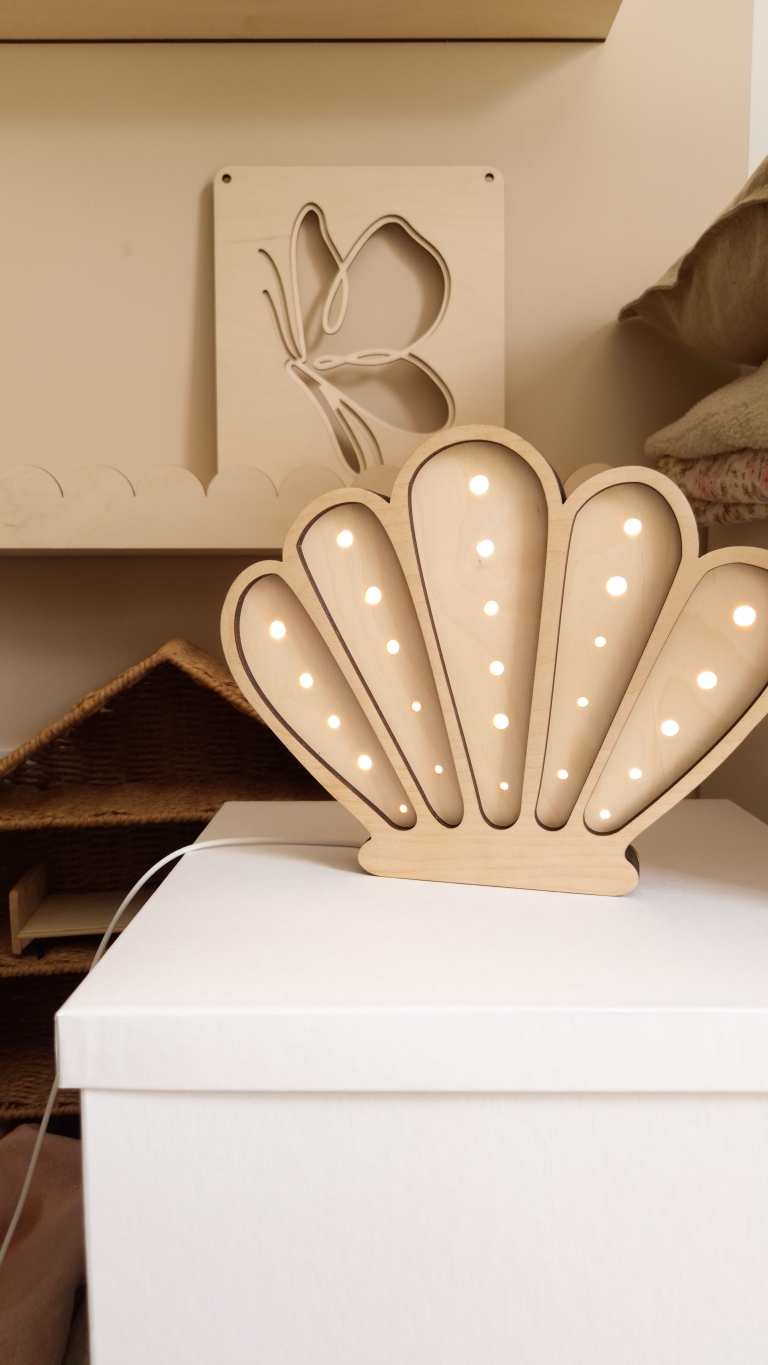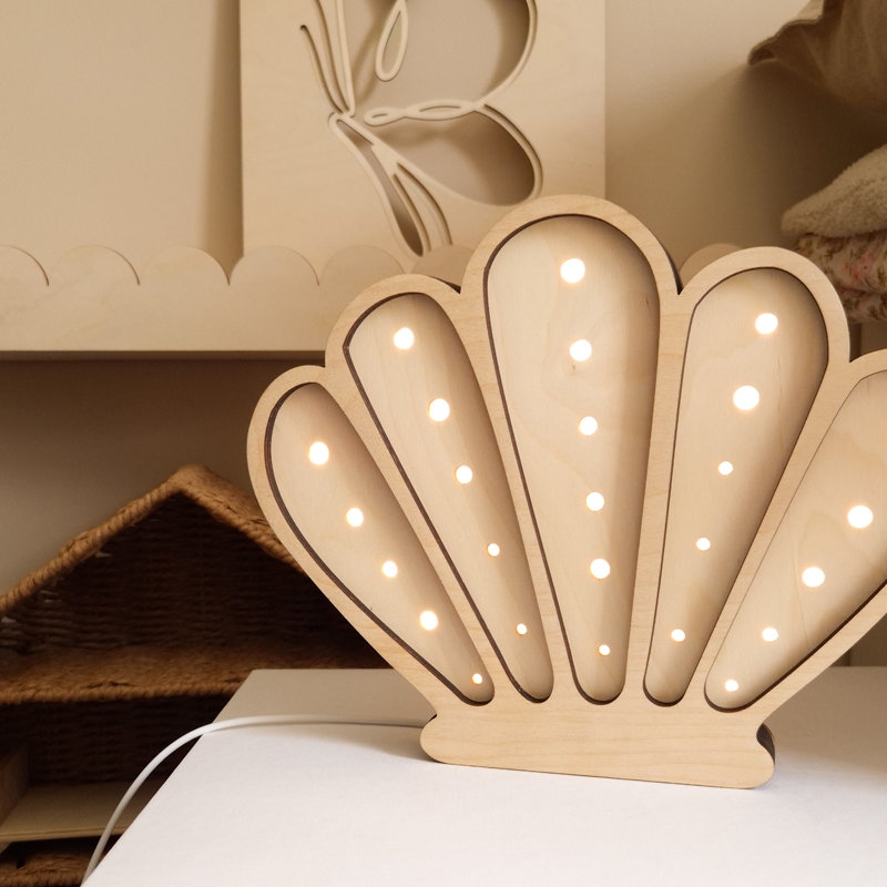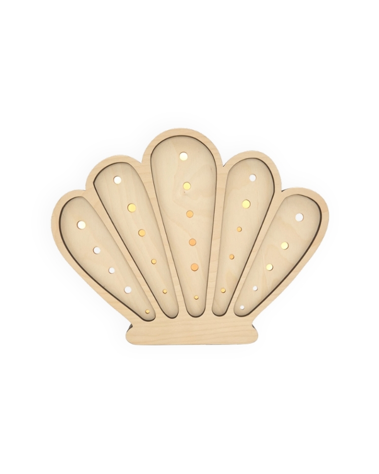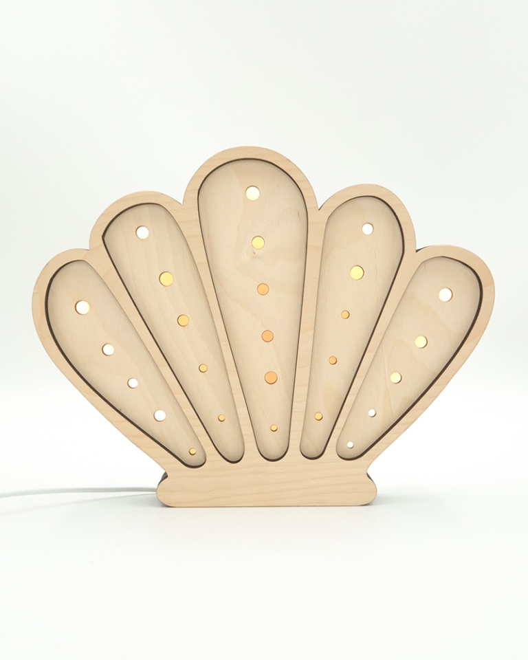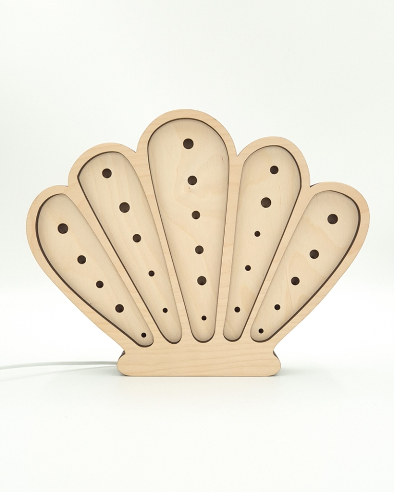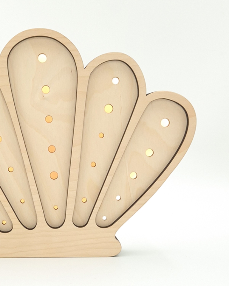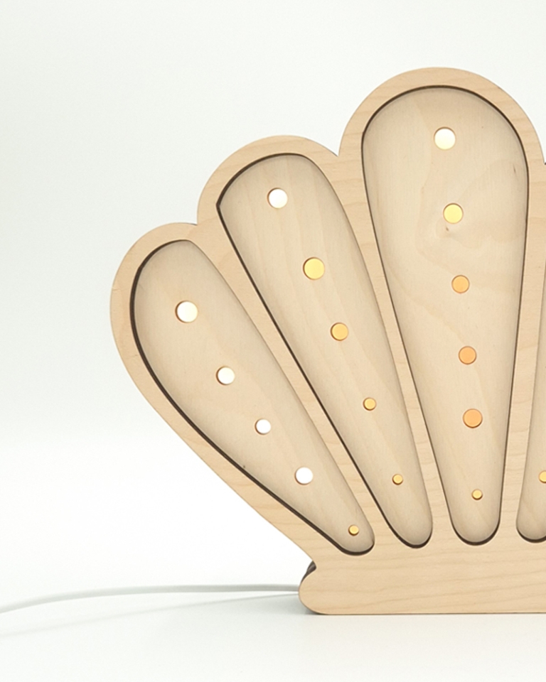 Dekoracyjna lampka dziecięca Muszelka wykonana została z wysokiej jakości, certyfikowanej sklejki brzozowej oraz wyposażona jest w sześciostopniowy ściemniacz z technologią płynnej zmiany natężenia światła. Dodatkowo model oferuje dwie barwy oświetlenia do wyboru (neutralną lub ciepłą).