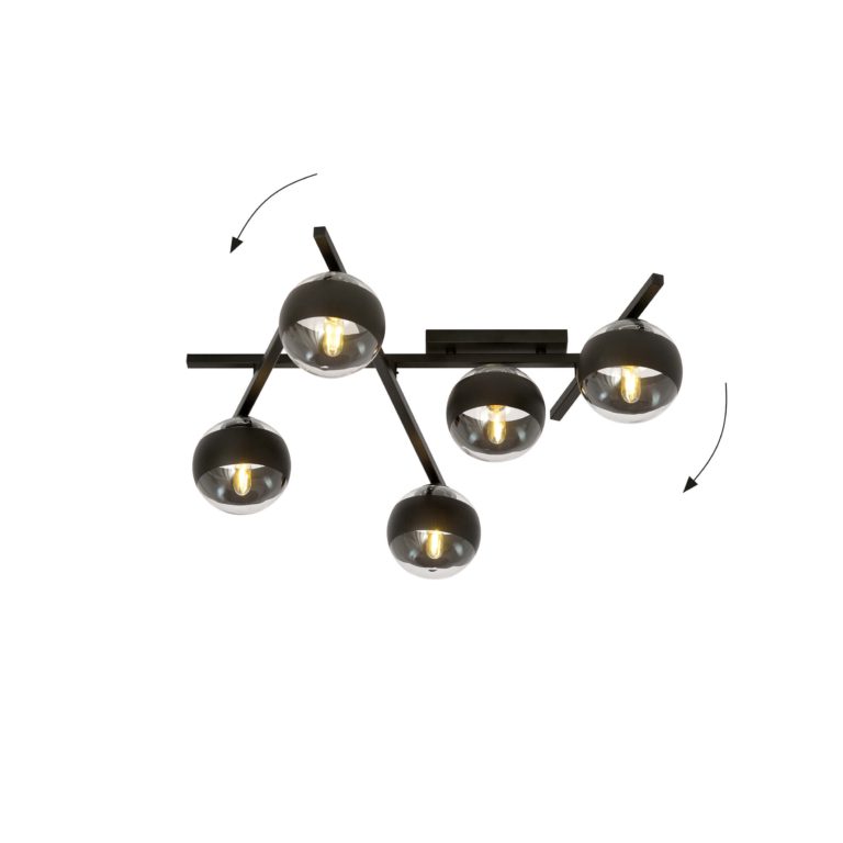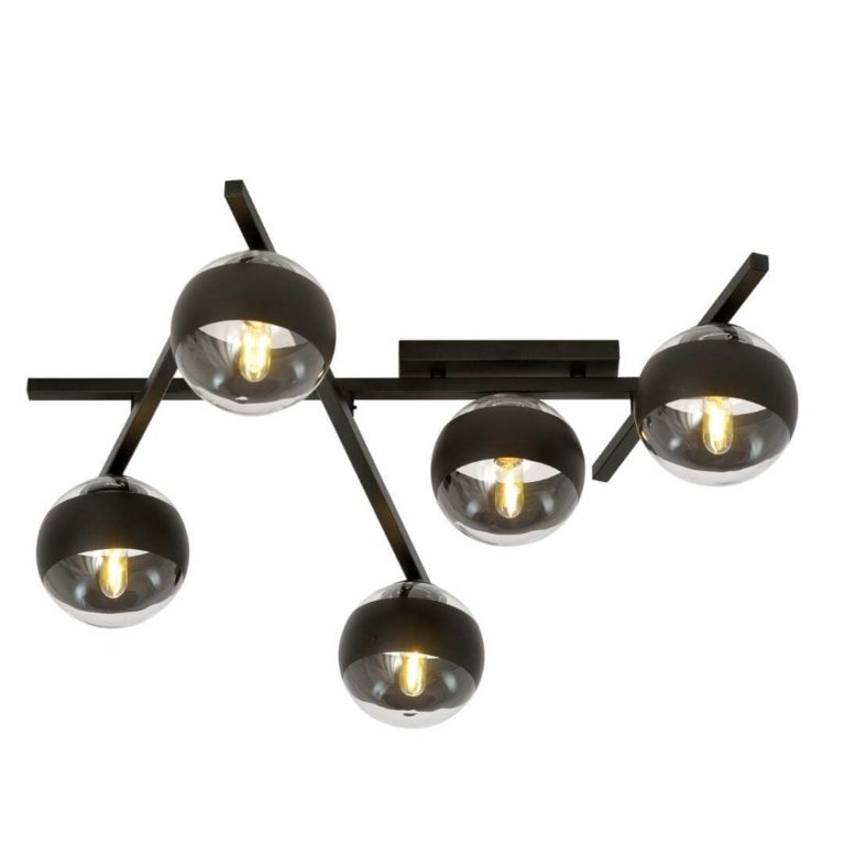 Kolejną z ważnych cech, które opisują sufitową lampę Harpo 5, są niezwykle designerskie klosze. W sumie jest ich pięć i każdy kryje w sobie jedno źródło światła. Klosze mają postać idealnych kul, które wykonano z transparentnego szkła, będącego jednym z najmodniejszych trendów w ostatnim czasie. Dzięki zastosowaniu tego rodzaju oprawy żarówki są jedynie delikatnie przysłonięte czarnym paskiem, który biegnie dookoła każdej kuli. Tak wyglądająca lampa na sufit do salonu i biura wyjątkowo dobrze pasuje do aranżacji industrialnych oraz nowoczesnych, w których często wykorzystuje się przezroczyste szkło.