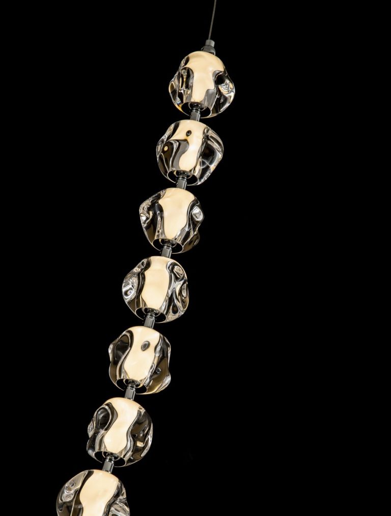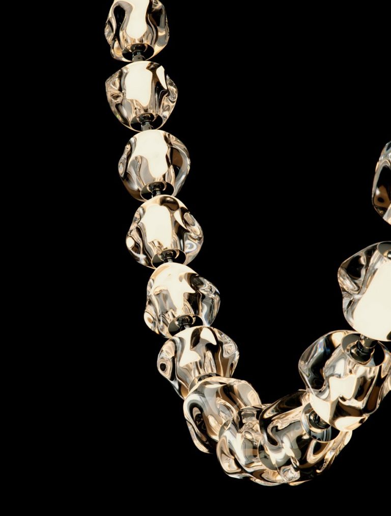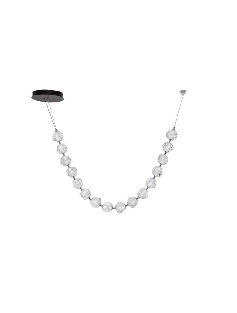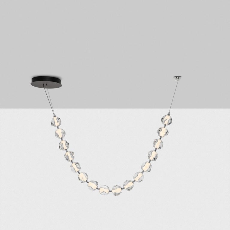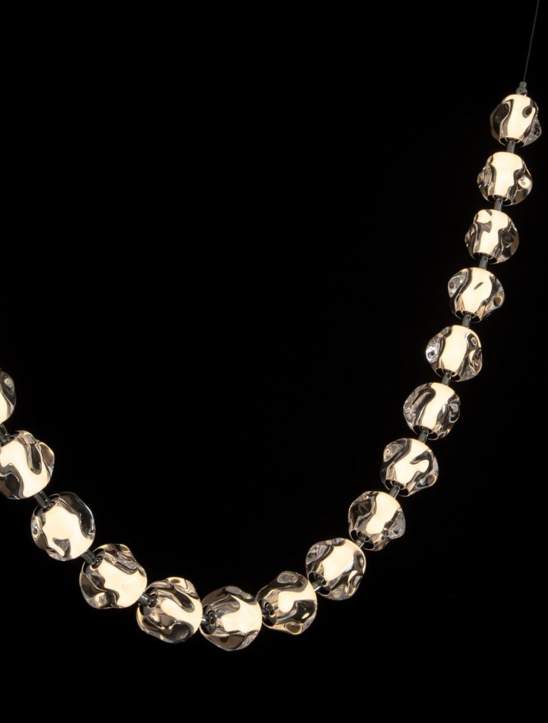 Designerska lampa sufitowa Chepen na okrągłej podsufitce posiada oryginalny klosz składający się z kilkunastu elementów, który zawiesza się pod sufitem w dwóch punktach. Klosz swobodnie opada tworząc świetlny łańcuch! Oferowana lampa w designerskim stylu Chepen dostępna jest w trzech różnych wielkościach, co daje możliwość dopasowania jej do różnych przestrzeni.