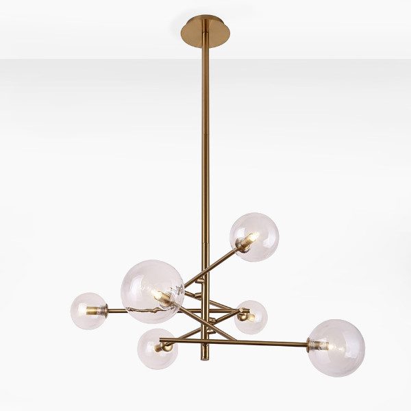 Na tę szczególnie wyjątkową propozycję składa się metalowa konstrukcja z metalu w mosiężnym kolorze oraz przepiękne transparentne klosze ze szkła o kulistym kształcie. To nieszablonowe oświetlenie sufitowe zachwyca symetryczną kompozycją, którą w szczególności docenią miłośnicy harmonii.
