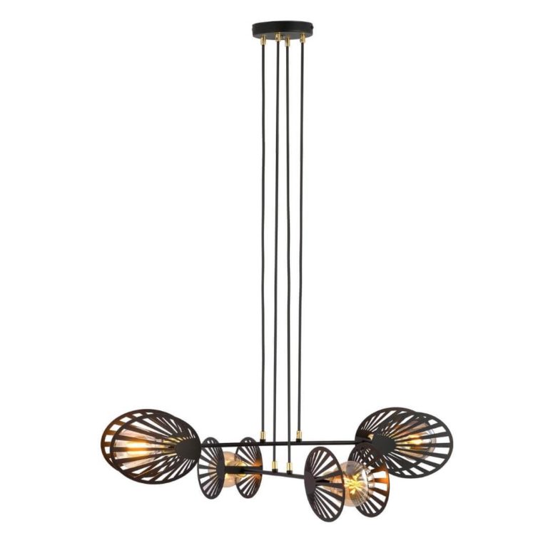 Lampa wisząca w designerskim stylu Cordelia 4 wyróżnia się unikatowym wyglądem, a to zasługa głównie oryginalnej budowy stelaża oraz dekoracyjnych kloszy w formie ażurowych dysków, które jedynie częściowo osłaniają źródła światła. Tych z kolei jest cztery i wszystkie przystosowane są do żarówek z dużym gwintem (E27, w tym LED). Cała oprawa ma postać nowoczesnego żyrandola, który wykonany jest ze stali lakierowanej na czarno oraz ozdobionej złotymi detalami. Szerokość oświetlenia wynosi 93 cm, średnica podsufitki 14 cm.
