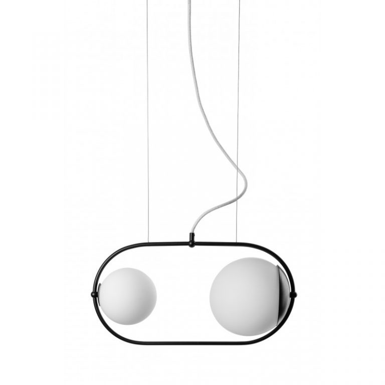 Dostępna u nas lampa wisząca Koban A wyposażona jest w dwa mlecznobiałe kuliste klosze. Tego rodzaju szkło jest jednym z najgorętszych hitów ostatnich lat. Delikatnie rozprasza światło wprowadzając przyjemną atmosferę. Nie razi w oczy, a przy tym doskonale oświetla całą przestrzeń. Metalowy stelaż w kolorze czarnym kontrastuje z kloszami i stylowo je okala.