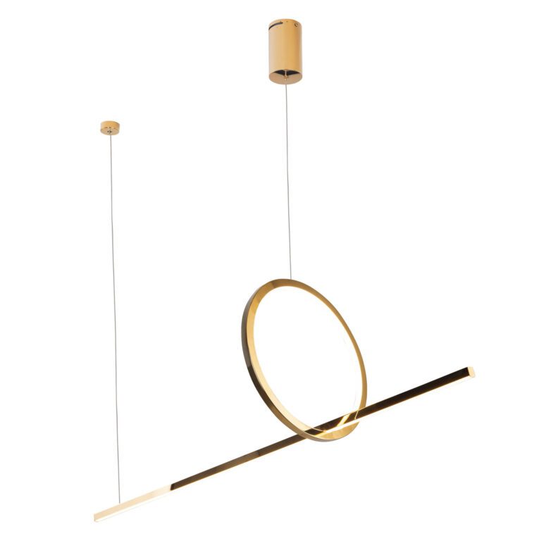 Już na pierwszy rzut oka model ten przykuwa uwagę bardzo oryginalną konstrukcją. Designerska lampa Lozanna składa się z dwóch głównych części – okręgu i wpisanej w niego listwy. Całość utrzymana jest w złotym kolorze, przez co prezentuje się jeszcze bardziej interesująco. Jeśli chodzi o wymiary, średnica obręczy wynosi 30 cm, długość listwy 100 cm, a wysokość całej lampy jest regulowana – maksymalnie może być to jednak nawet 150 cm!