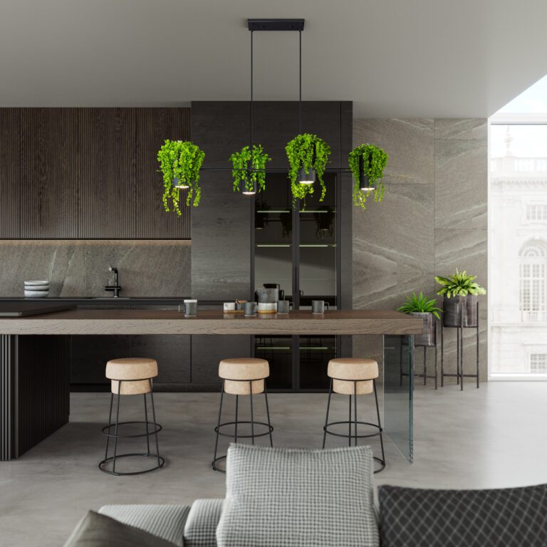 Ten wyjątkowy model łączy funkcję oświetleniową z dekoracyjną – wyposażony jest w aż cztery źródła światła, które jednocześnie są osłonkami na doniczki z roślinami. Nowoczesna lampa wisząca KUKKIA składa się z metalowego stelaża, który ma aż 142 cm szerokości oraz 62 cm głębokości. Długość zawieszenia podlega regulacji w zakresie od 40 do nawet 150 cm, dzięki czemu model ten nadaje się zarówno jako oświetlenie centralne, jak i dodatkowe (na przykład nad wyspę kuchenną).