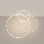 Designerska lampa wisząca z trzema pierścieniami Rio 3 w białym kolorze to także zintegrowanie oświetlenie LED o ciepłej lub neutralnej barwie światła (3000/4000 K). Ponadto model dostępny jest w wersji sterowanej za pomocą nowoczesnych rozwiązań, jak pilot, aplikacja, czy system DALI.