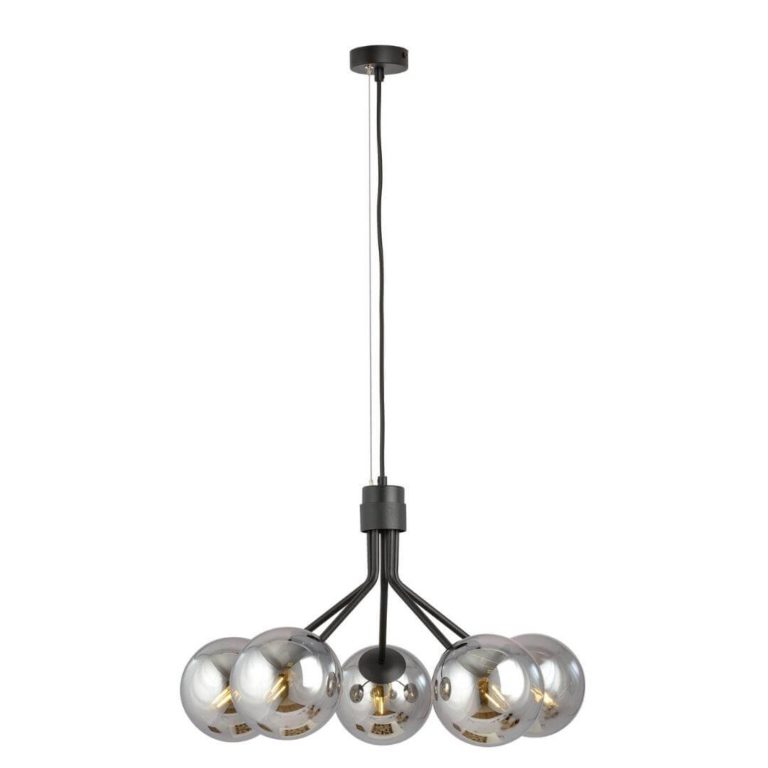 Lampy wiszące-kule to jedne z najbardziej eleganckich rodzajów oświetlenia. Doskonałym na to przykładem jest polecany przez nas model Bond 5, który wyposażony jest w aż pięć kulistych kloszy. Ich idealny kształt wyjątkowo dobrze współgra z popielatym kolorem szkła oraz jego połyskującym wykończeniem. Klosze przepięknie odbijają światło, wnosząc do wnętrza jeszcze więcej blasku. Każda kula ma średnicę 14 cm i kryje w sobie oprawkę na jedną żarówkę. Odpowiednie będą tu źródła światła z małym gwintem (E14).
