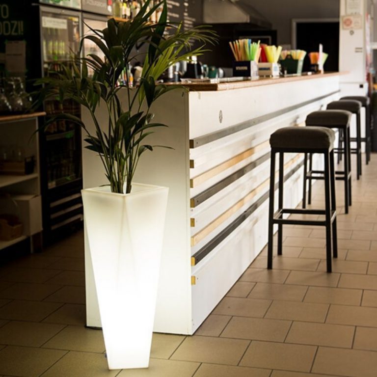 Podświetlana donica Violet charakteryzuje się niestandardową, geometryczną formą, która idealnie wpasuje się do nowoczesnych wnętrz lub stanie się ciekawym dodatkiem ozdabiającym balkon, taras czy ogród. Materiał, z którego wykonano produkt jest niezwykle trwały i odporny na uszkodzenia mechaniczne, takie jak zarysowania czy wgniecenia. Dodatkowym atutem donicy jest wysoka odporność na skrajne temperatury, promienie słoneczne i wilgoć – pozwala to na jej użytkowanie także na zewnątrz.