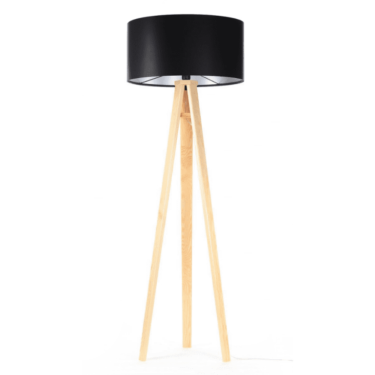 Sosnowy trójnóg dodaje lekkości oraz wprowadza do każdej aranżacji przytulny klimat. Abażur w czarnym kolorze wyposażony został w srebrne wnętrze, które dodaje całości nieco eleganckiego charakteru. Ta lampa podłogowa na trzech nogach występuje także w innych wersjach kolorystycznych: czarnej oraz antracytowej. Dzięki czemu bez trudu dopasować możesz ten model do wielu różnych aranżacji.