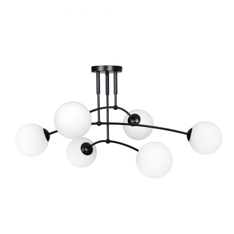 Lampa sufitowa ma formę nowoczesnego żyrandola, na który składa się wyjątkowy stelaż wykonany ze stali lakierowanej na czarno. Jego łukowate linie dodają całości lekkości oraz doskonale podkreślają kuliste klosze. Te z kolei wykonano ze szkła o mlecznobiałym wykończeniu, które przepięknie rozprasza światło, a jednocześnie doskonale oświetla wybraną przez Ciebie przestrzeń.