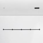 Cała lampa składa się z podsufitki, niemal niewidocznych linek montażowych oraz podłużnego, wąskiego stelaża wyposażonego w pięć kloszy rozmieszczonych w równych odstępach. Całość to dobrze przemyślana, harmonijna konstrukcja o minimalistycznym charakterze. Model ma aż 156 cm szerokości, dzięki czemu doskonale prezentuje się nad dużym stołem w jadalni, nad wyspą kuchenną, ale też w przestronnym salonie, czy holu.